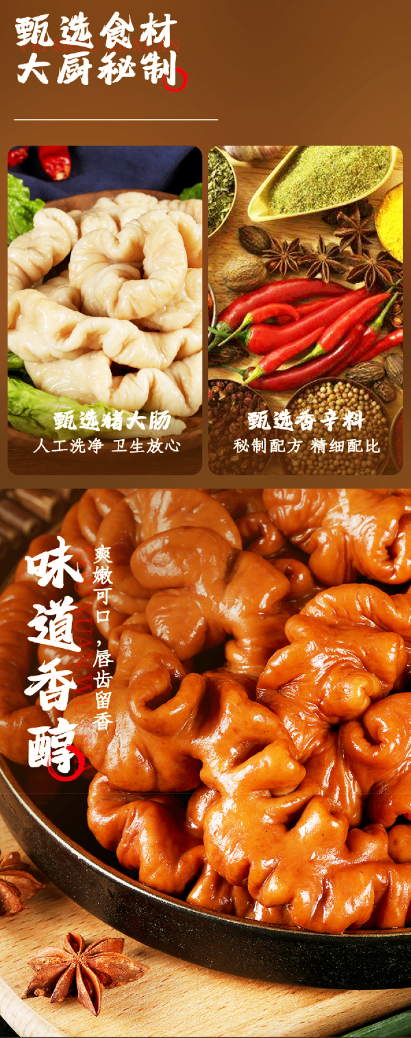 - 重慶鹵豬大腸供應商 重慶鹵小福是一家專業(yè)從事豬副產(chǎn)品的工廠,擁有高標準現(xiàn)代化生產(chǎn)車間6000余平方米,憑借多年持續(xù)不斷