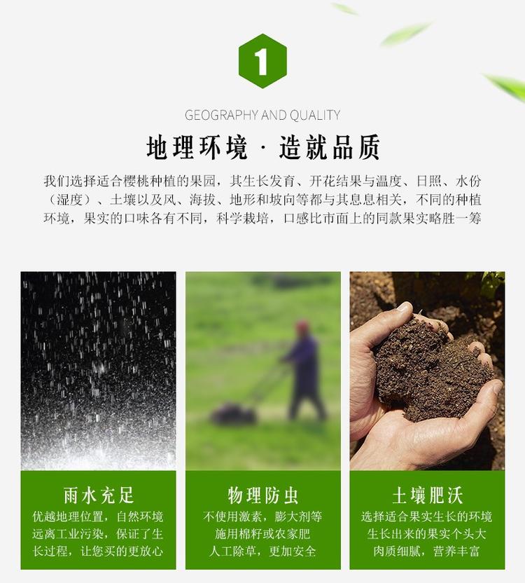 地理環(huán)境 · 造就品質(zhì)我們選擇適合櫻桃種植的梁園.其生長發(fā)育、開花結(jié)梁與溫度、日照、水份植籌(濕度)、土壤以及風(fēng)、海拔、地形和坡向等都與其.它、息相關(guān),不同的種環(huán)境,果實(shí)的日味齊有不同,科學(xué)栽培, lJ 感比市而上的同款果實(shí)略勝~「一二丁丁二洲雨水充足習(xí)/瀚理防蟲優(yōu)越地理位置,自然環(huán)境遠(yuǎn)離工業(yè)污染,保證了生長過程,讓您買的更放心不使用激素,膨大劑等施用棉籽或農(nóng)家肥人工除草,更加安全土壤肥沃選擇適合果實(shí)生長的環(huán)境生長出來的果實(shí)個(gè)頭大肉質(zhì)細(xì)膩,營養(yǎng)豐富