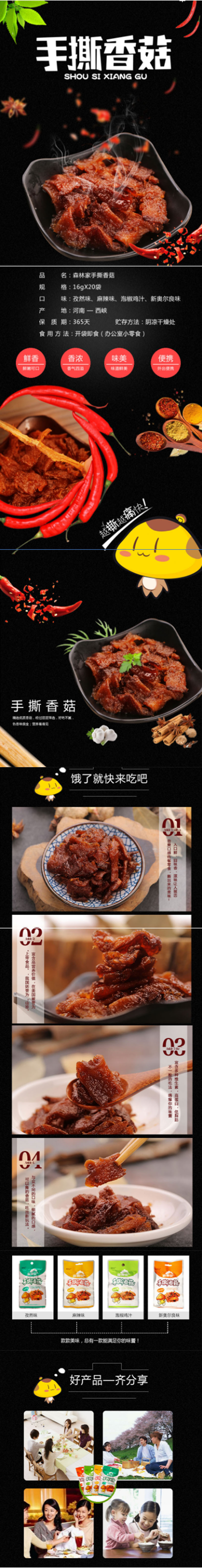 森林家手撕香菇食用方便,營(yíng)養(yǎng)美味,生產(chǎn)的麻辣味、泡椒雞汁味、孜然味和新奧爾良味適應(yīng)了不同的口感,已被認(rèn)可,是公司的拳頭產(chǎn)品