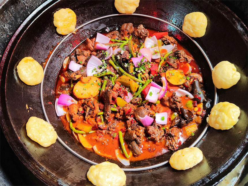 采用柴火熏烤的方式,讓雞肉在柴火中慢烤,選用特色跑山雞,肉質(zhì)鮮嫩而不膩。