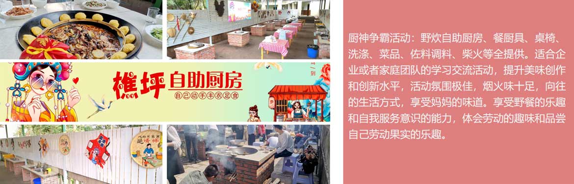 廚神爭(zhēng)霸活動(dòng):野炊自助廚房、餐廚具、桌椅、洗滌、菜品、佐料調(diào)料、柴火等全提供。適合企業(yè)或者家庭團(tuán)隊(duì)的學(xué)習(xí)交流活動(dòng),提升美味創(chuàng)作和創(chuàng)新水平,活動(dòng)氛圍極佳,煙火味十足,向往的生活方式,享受媽媽的味道。享受野餐的樂(lè)趣和自我服務(wù)意識(shí)的能力,體會(huì)勞動(dòng)的趣味和品嘗自己勞動(dòng)果實(shí)的樂(lè)趣。