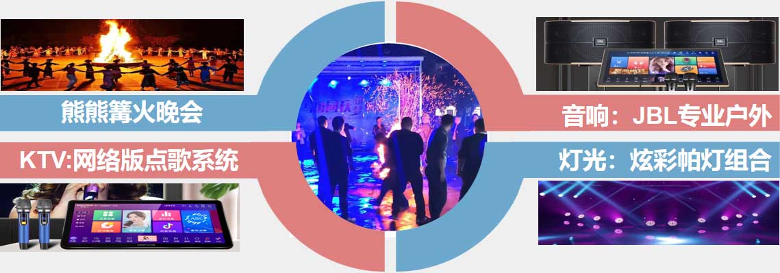 篝火晚會(huì):木材材料,持續(xù)然后2小時(shí)左右。配有高端音響系統(tǒng)、點(diǎn)歌系統(tǒng)、視頻投影、彩色氛圍燈光。