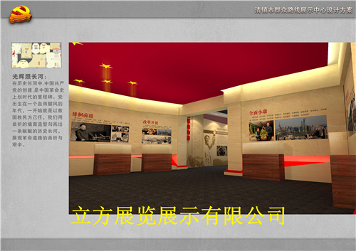 重慶黨員活動(dòng)室設(shè)計(jì),重慶立方展覽展示有限公司是一家集整體策劃、創(chuàng)意設(shè)計(jì)、科技布展、工程施工及后期維護(hù)于一體的專業(yè)型服務(wù)公司,旗下設(shè)立貴陽分公司、西安分部。專注于各類博物館、紀(jì)念館、規(guī)劃館、科技館、陳列館、校史館等大型展館;以及政府展廳、企業(yè)展廳、文化展廳、廉政展廳、教育基地、國際化商業(yè)展覽展示等展陳空間的設(shè)計(jì)與施工。