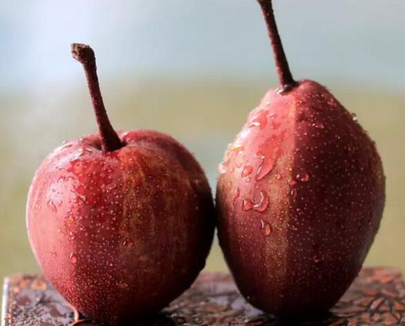 紫紅色,果面光滑,有光澤,并具棱狀突起,果皮薄而脆,果心較小,瓤肉瑩白,質(zhì)細(xì),酥脆爽口