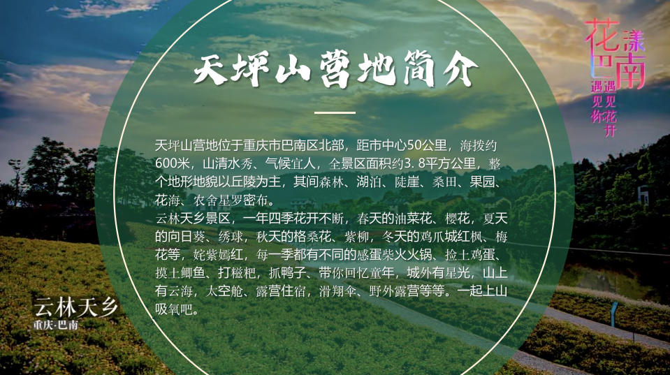 天坪山營(yíng)地位于重慶市巴南區(qū)北部,距市中心50公里,海撥約600米,山清水秀、氣候宜人,全景區(qū)面積約3.8平方公里,整個(gè)地形地貌以丘陵為主,其間森林、湖泊、陡崖、桑田、果園、花海、農(nóng)舍星羅密布。