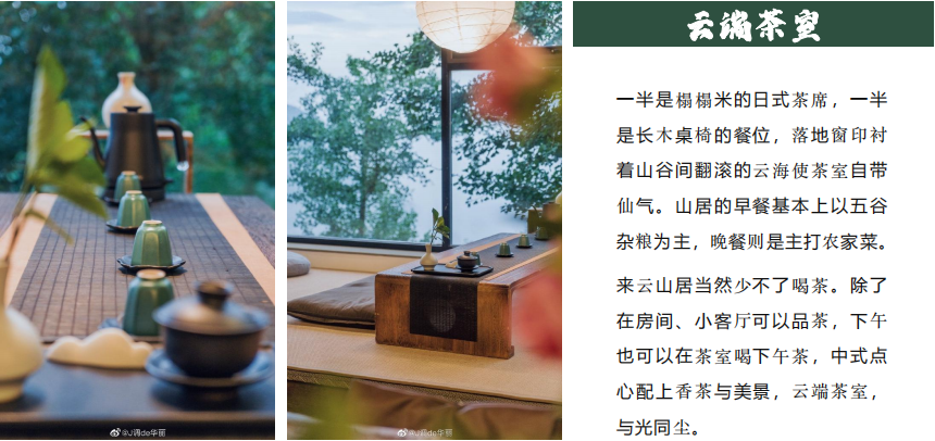 一半是榻榻米的日式茶席,一半 是長(zhǎng)木桌椅的餐位,落地窗印襯 著山谷間翻滾的云海使茶室自帶 仙氣。山居的早餐基本上以五谷 雜糧為主,晚餐則是主打農(nóng)家菜。 來(lái)云山居當(dāng)然少不了喝茶。除了 在房間、小客廳可以品茶,下午 也可以在茶室喝下午茶,中式點(diǎn) 心配上香茶與美景,云端茶室, 與光同塵。