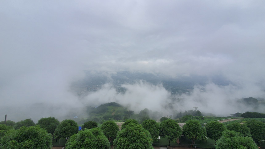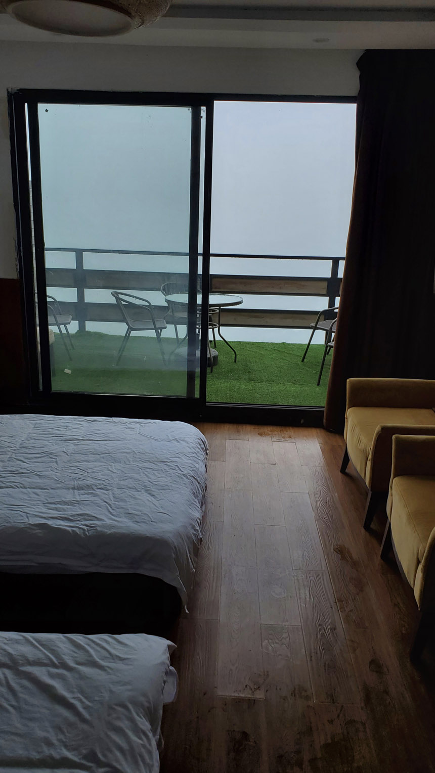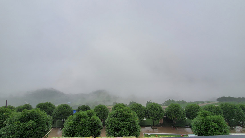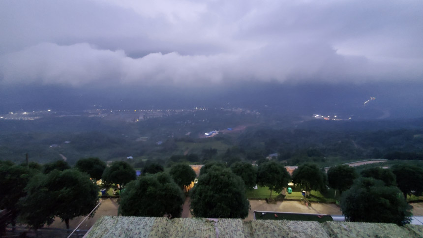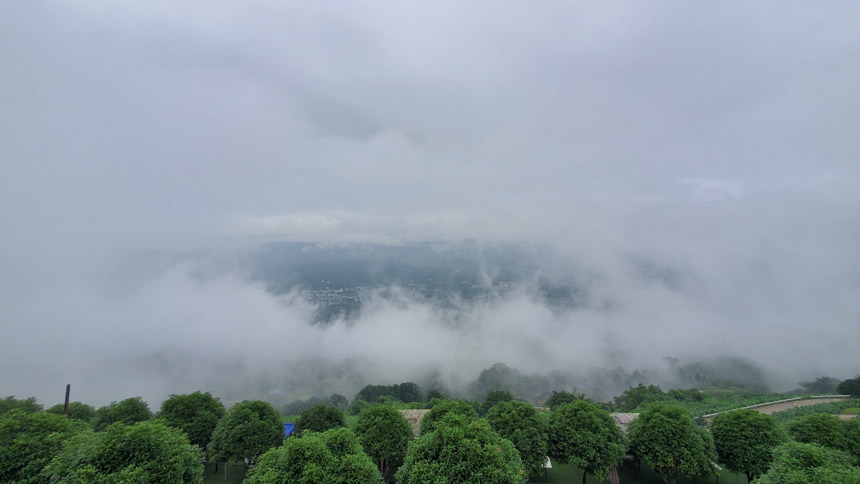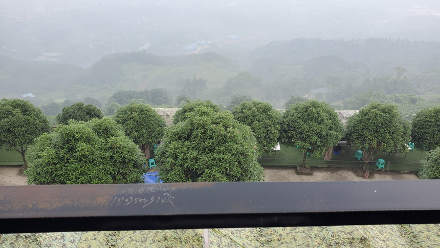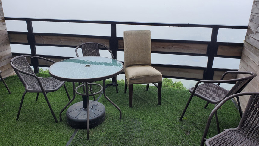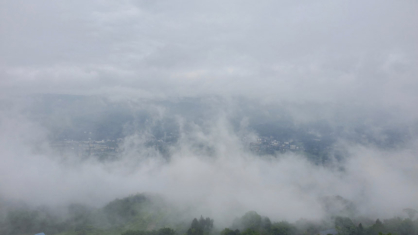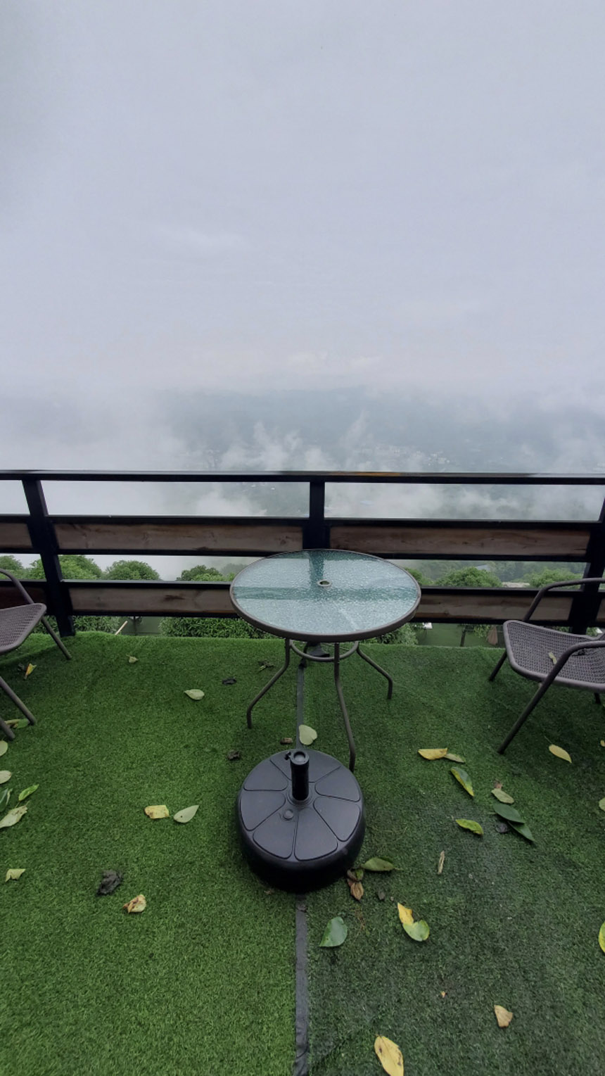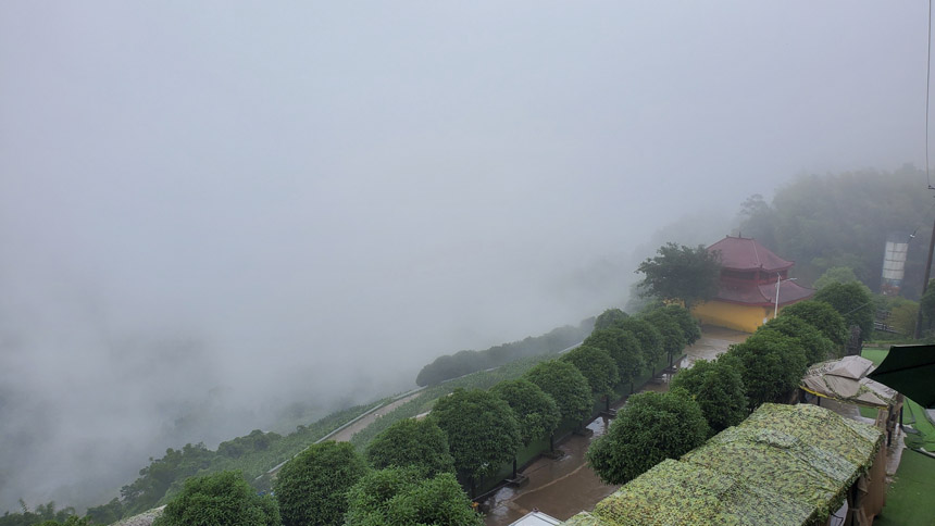雨慢慢地停了,房間露臺外出現(xiàn)了云霧繚繞的景象。