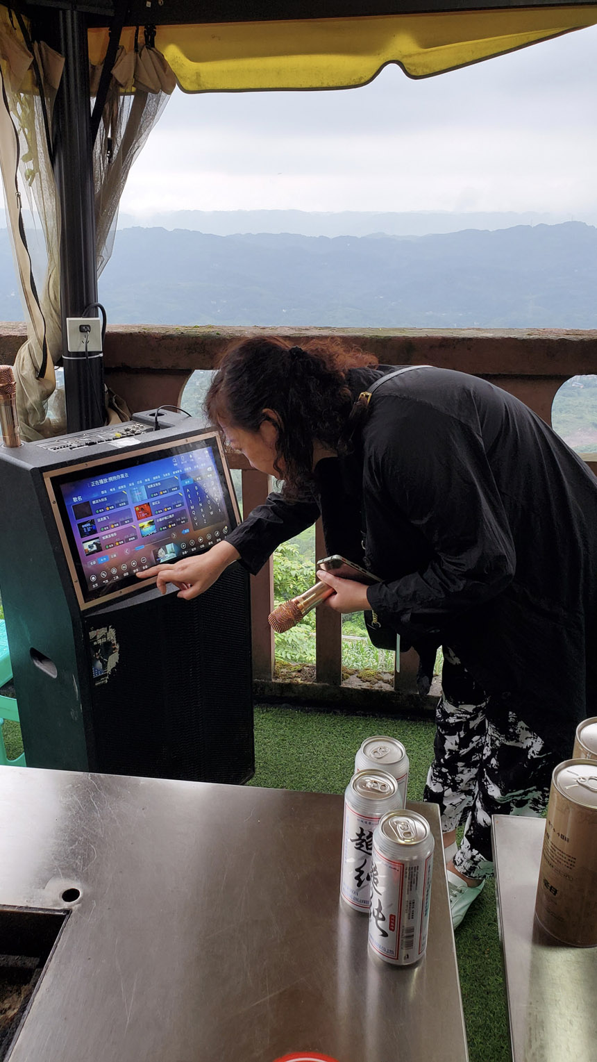 來到懸崖邊,還有一桌人在一邊燒烤一邊K歌。