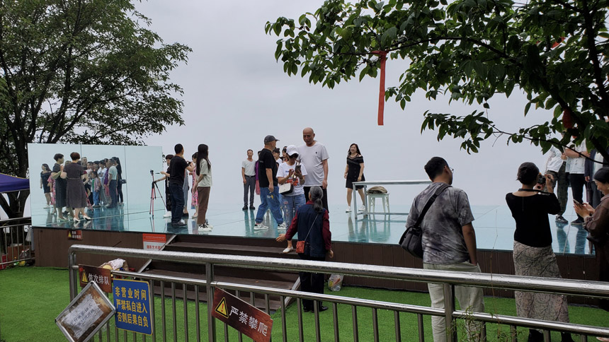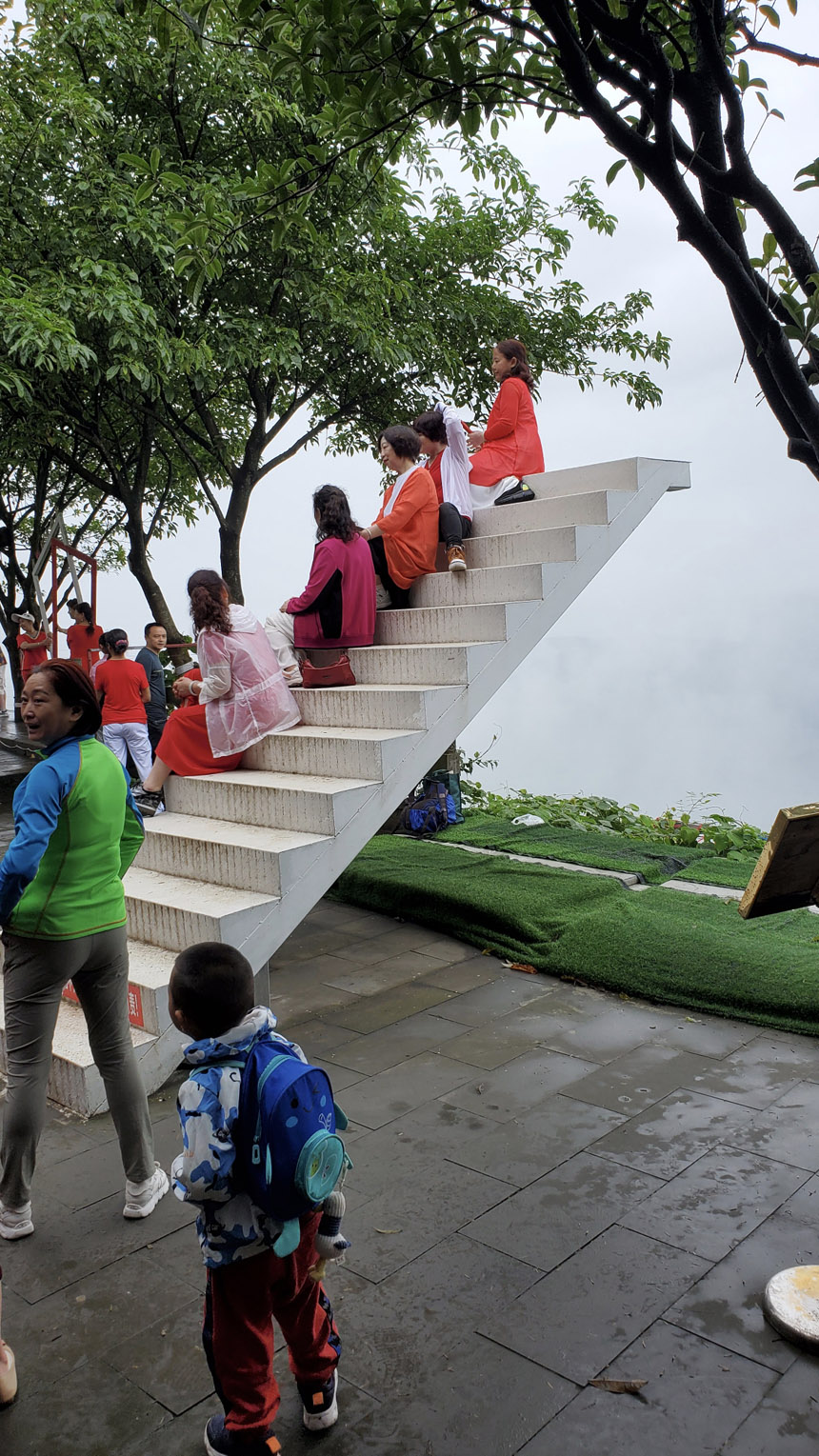 天空之鏡上擠滿了人,拍一張干凈的照片很不容易。其它打卡景點(云上佛手、云上天梯、天空之門、玻璃球秋千、一帆風(fēng)順、網(wǎng)紅鳥巢)都在從天空之鏡右轉(zhuǎn)上行的懸崖邊,我們右轉(zhuǎn)繼續(xù)上行來到云上天梯,也是人滿為患。