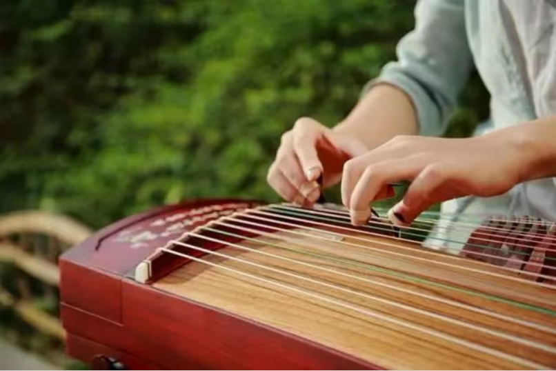 櫻花林,小涼亭,女子彈起古箏,琴聲徐徐響起,別有一番幽靜滋味。