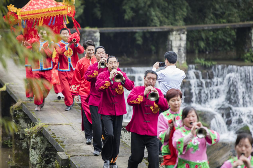 大花轎吹打表演,一起感受非物質(zhì)文化遺產(chǎn)“接龍吹打”的魅力。提供游客換裝互動體驗坐花轎,歡迎了解非遺文化,傳承非遺之美!
