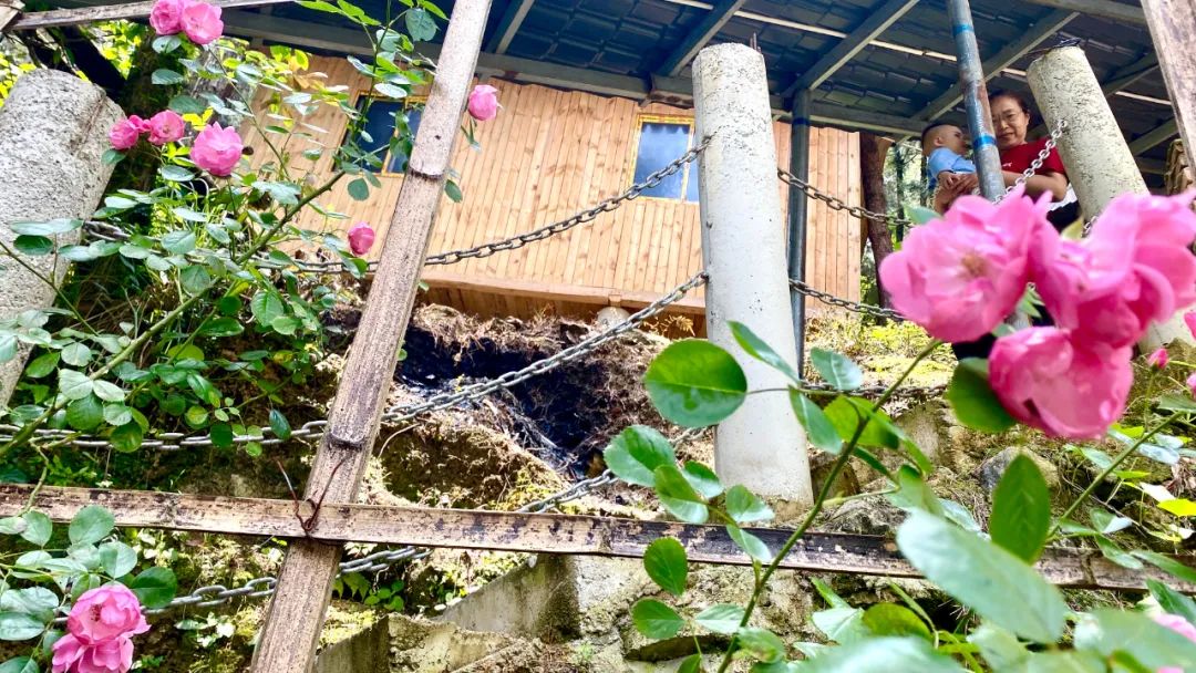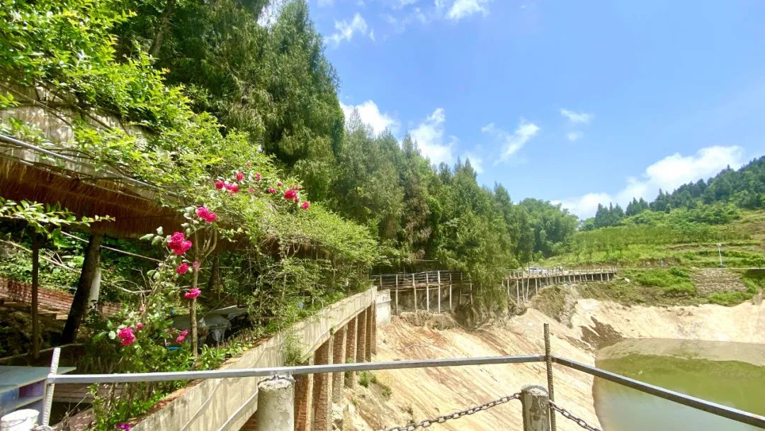 清晨,推窗遠(yuǎn)眺,群山霧氣繚繞,鳥鳴啁啾,倚坐在庭院藤蔓下的石凳上,朝霞打在頭頂上的藤枝上鮮花嬌艷欲滴,枝蔓翠綠濃郁。