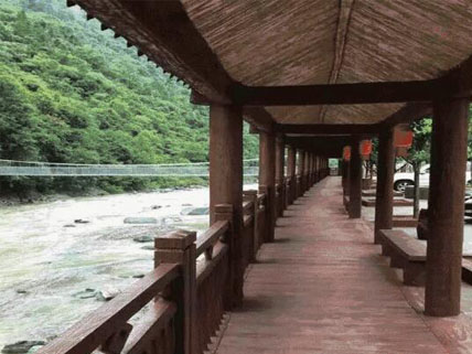 山莊設有梅花鹿養(yǎng)殖基地、板栗基地、生態(tài)茶園等農(nóng)業(yè)基地,室外還有大型停車場、環(huán)山步道、玻璃橋、觀光索橋、天然游泳池。