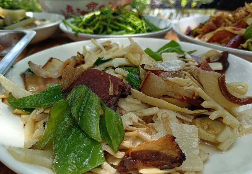竹筍炒臘肉 竹筍炒臘肉好吃,而且價格實惠,環(huán)境也很不錯,是這家農(nóng)莊的招牌菜之一。