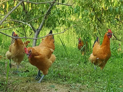 農(nóng)莊后面是一大片林地,有果樹,也散養(yǎng)了很多雞鴨,都不用刻意喂養(yǎng),雞鴨就可以長得很好,這才叫生態(tài)雞、純天然鴨子嘛。來耍的朋友可以買起帶走,土雞蛋也有,價(jià)格嘛,和老板私聊喲~