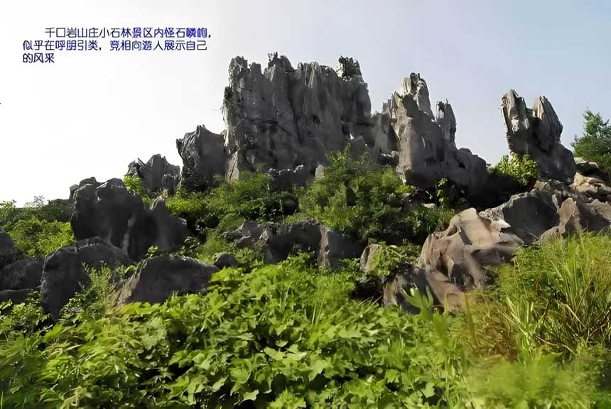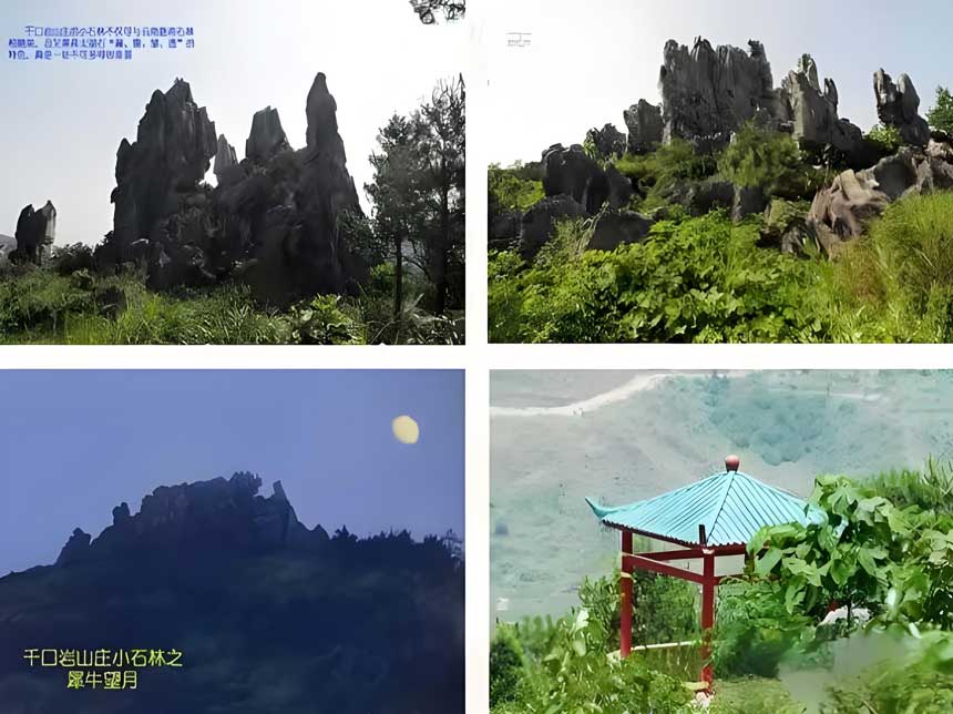 石林千口巖休閑山莊座落于風(fēng)景秀媚,空氣清新的合川三匯壩華鎣山南麓。山雄林茂,動植物豐富,到處是鬼斧神工的天然石林。山雄林茂,天然石林,動植物豐富,綠色食品,山莊內(nèi)提供住宿,棋牌娛樂及特色飲食。是休閑、度假、避暑,登山的理想挑選。