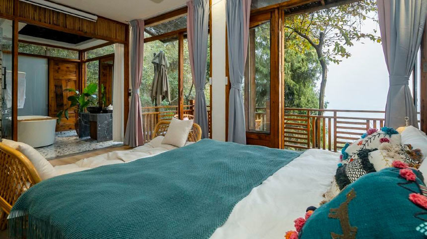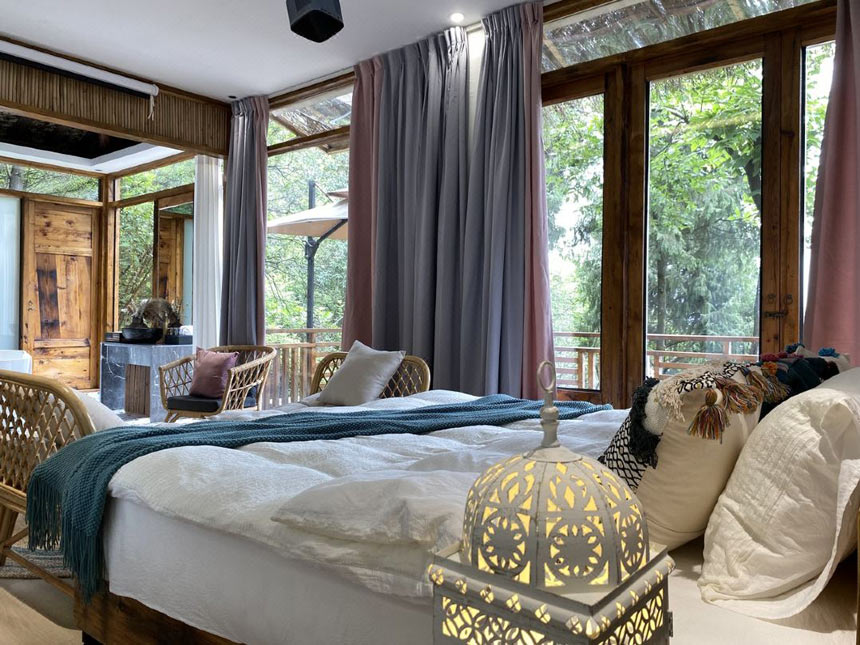 入住體驗(yàn) 我們訂的「聽雨閣」loft房型 全景落地窗正對(duì)云霧山谷 清晨推開窗就能擁抱云海 房間里熏著淡淡的檀香 配著手工燒制的陶器茶具 泡一壺金駿眉看云卷云舒 這才是生活該有的樣子啊
