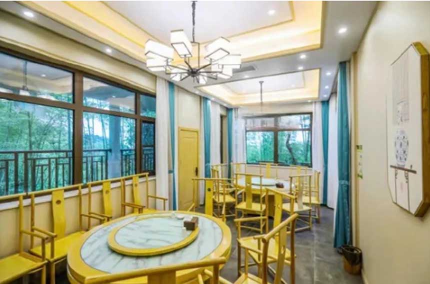 這是獨(dú)立的餐飲樓,外觀為城墻造型,古樸而不失趣味。一樓設(shè)溫馨卡座,二樓設(shè)精美包房,可同時(shí)容納近百人就餐。主打川菜菜系,特色菜品以茶竹菌類為主。