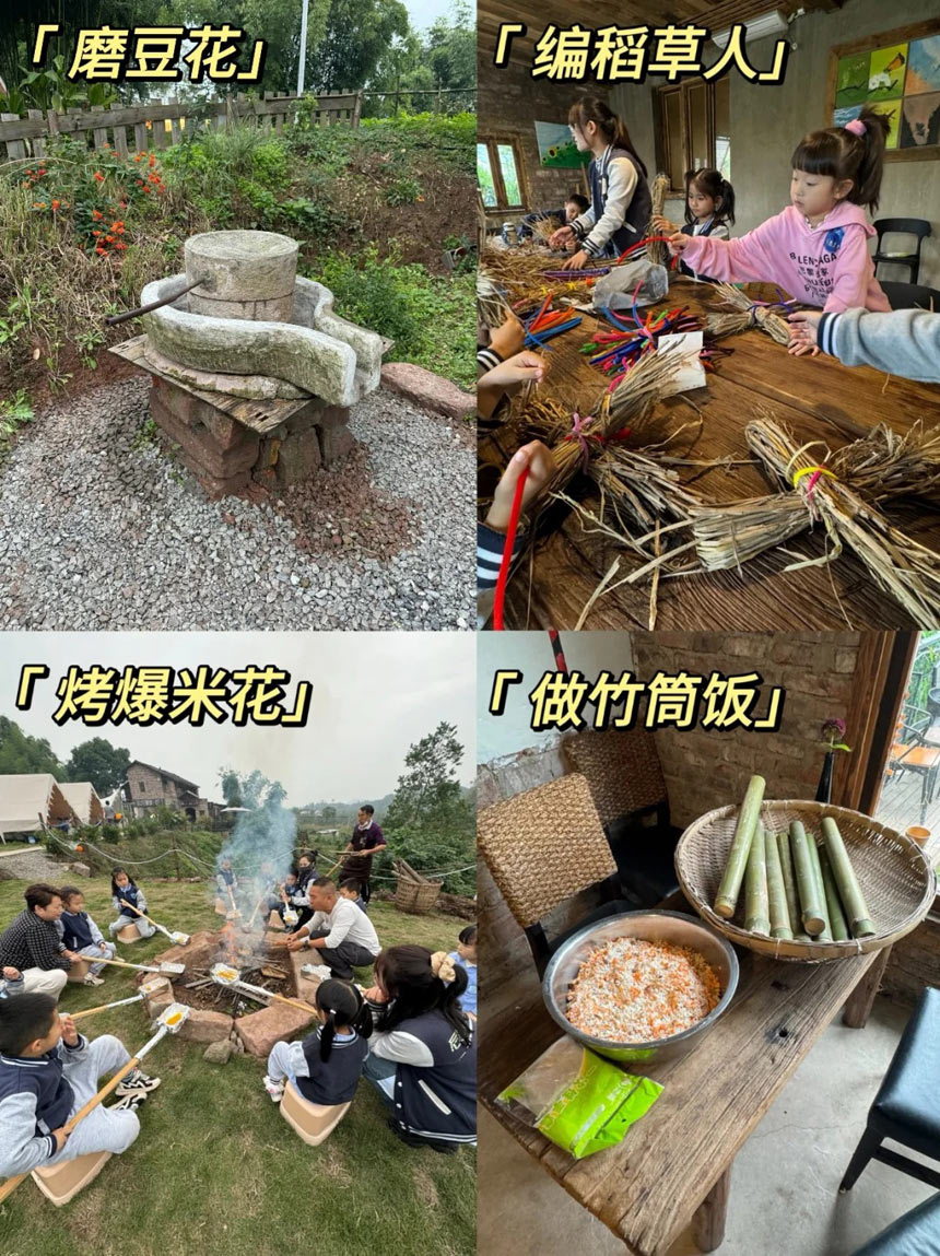 擼袖子上陣系列、渾水摸魚(夏季專屬)、拔河、磨豆花、打糍粑、做竹筒飯、親手創(chuàng)作系列、稻草人DIY、插秧(春季)、做青團(tuán)、烤紅薯