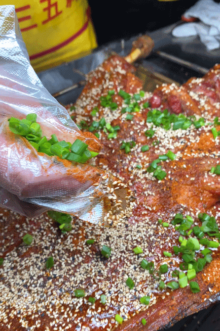 待到羊肉烤熟的時候,撒上秘制辣椒面和香料,再加以蔥花和香菜點綴,一頓能瞬間點燃食肉獸欲望的烤全羊就上桌了!