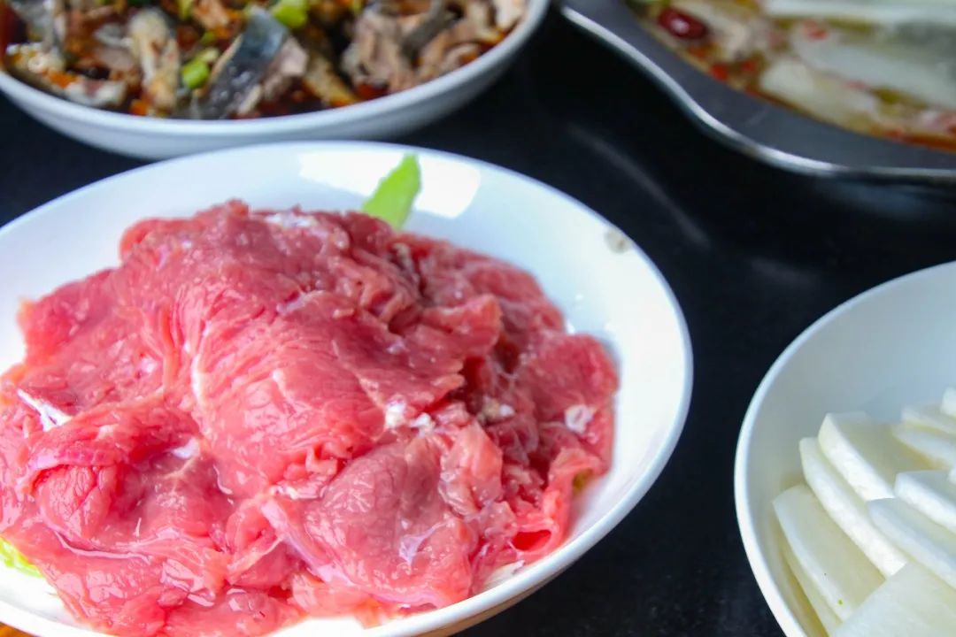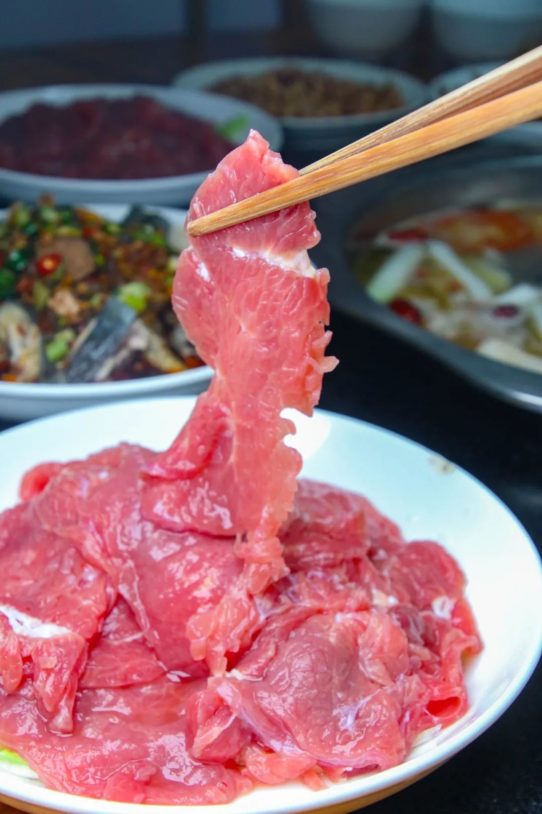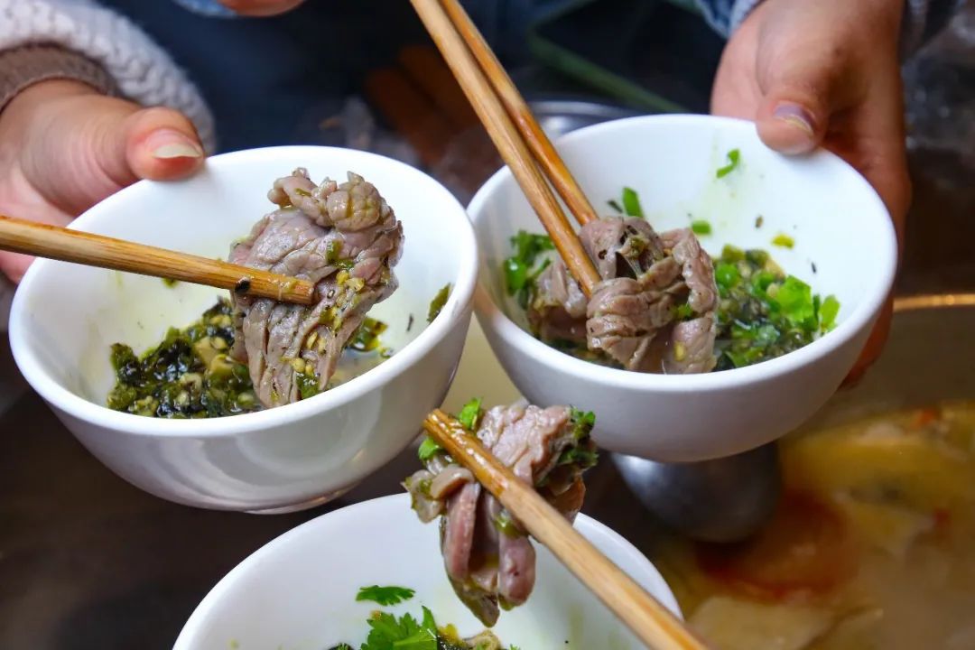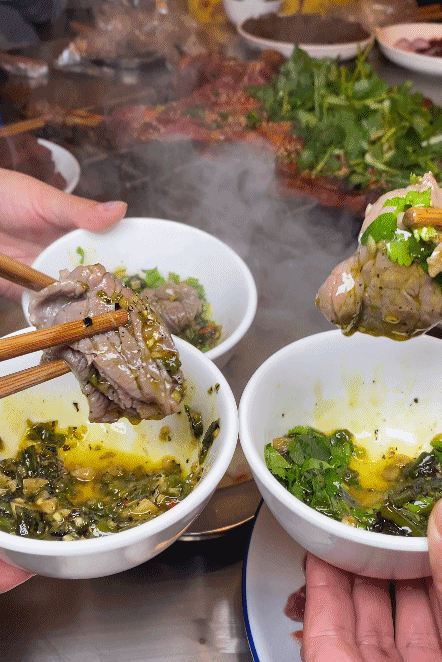 涮燙好的鴕鳥肉,吸住了火鍋湯底的湯汁,一口咬下去,細膩鮮嫩,帶有一絲甜味的鴕鳥肉和溢滿口腔的濃郁湯汁,蘸上特制青椒蘸料,這搭配絕了!