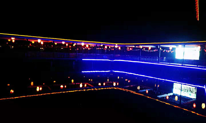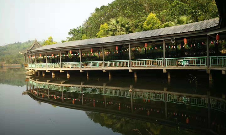 風(fēng)雨廊橋是這里最有意思的地方之一了風(fēng)雨廊橋建在了山塘一側(cè),回廊式建筑,設(shè)有餐桌。這里是水上餐廳,可以吃火鍋、烤全羊。橋下池水,似磨平的綠鏡,倒映著廊橋翹角上的紅燈籠,好似一幅明麗的水彩畫。