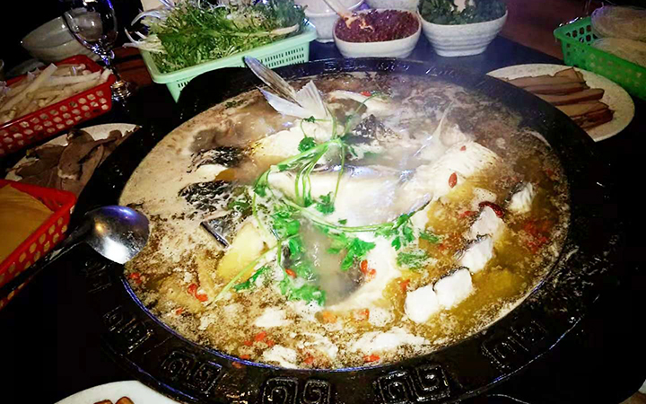 其中最有特色的就是他家的土雞湯燙魚了采用農(nóng)莊自己散養(yǎng)的土雞加入豬大骨用瓦罐熬制原湯整個(gè)原湯不加入調(diào)味品,雞湯鮮美,濃郁的土雞味,用熬制好的雞湯來煮魚,整個(gè)魚味、土雞味、大骨味完美融合,魚久煮不爛,入口即化,魚皮像果凍一樣Q彈