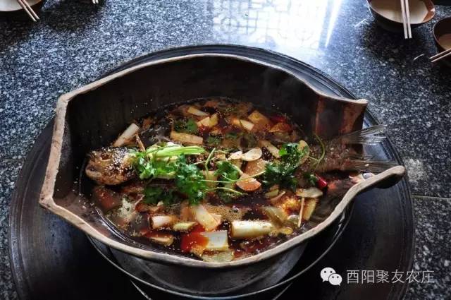 其實,我知道,農(nóng)莊的壇子魚也極具特色,還有奇特的來歷。相傳遠古時期,一土家老人在野外垂釣,由于收獲頗豐,待感到饑餓時已是下午時分。便四處尋找野果充饑,但尋遍山野也沒有找到可以充饑的野果。好在在他尋果的路途中撿到半邊壇子,就突發(fā)奇想,用這半邊壇子做鍋來煮釣到的魚。他說做就做,立即取來河水在河邊煮起魚來。也許是太過饑餓,又也許是壇子煮魚別具一格,讓他吃得格外的香,半邊壇子也不忍丟棄。由此,這道“壇子魚”,就這樣流傳了下來。