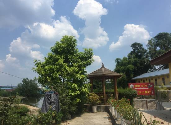 如果正好到了中午飯點(diǎn)兒,還可以就近找個農(nóng)家樂就餐。這家“恐龍湖水上餐廳”,沙灘、小船、吊橋……頗具特色。