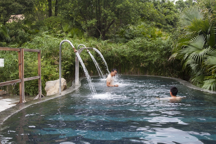 特色原湯溫泉區(qū):主要包含亂石浴、酒泉、茶泉、石板躺床、龍池、鳳池、灌頂池等。湯池周邊環(huán)境清幽,通過(guò)植物、柵欄的遮擋,保證泡湯的私密性。在溫泉中坐禪或者瑜珈,各式特色原湯溫泉帶來(lái)豐富的泡湯體驗(yàn),在詩(shī)情畫(huà)意中,輕身靜心,天人合一。