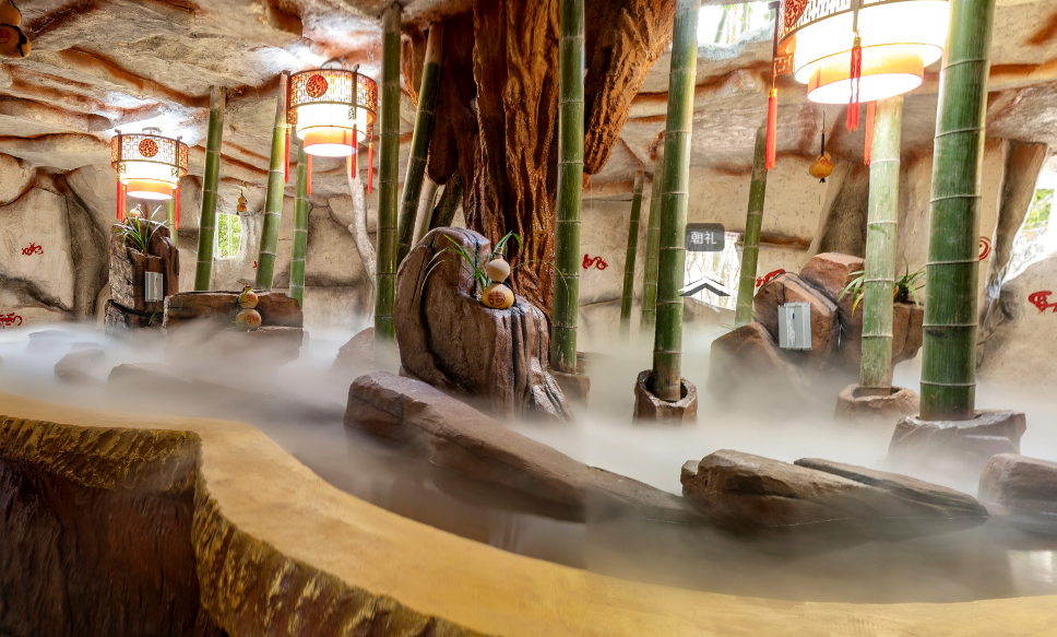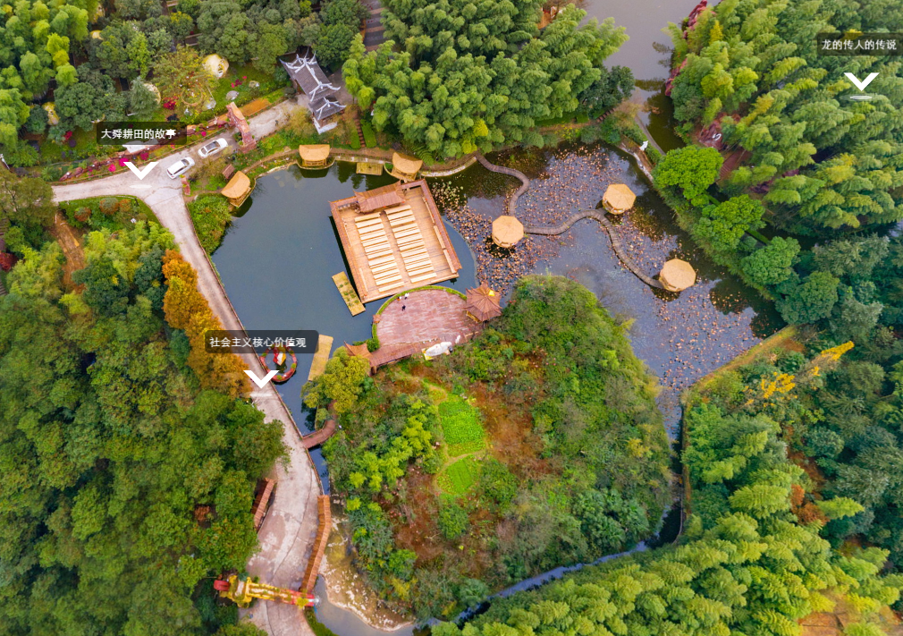 家風(fēng)禮院中有一個(gè)孝子林。林中,一株蓊郁繁茂的孝子樹屹立路旁,伸枝展葉迎接八方游客;奇石上鐫刻著“天下字道,無(wú)際鴻蒙”;24個(gè)形態(tài)奇異的蛋屋寓意“二十四孝”,“蛋”“誕”諧音,因此這些蛋屋名為“孝子誕洞”。在孝子誕洞中擺宴設(shè)席時(shí),將中國(guó)傳統(tǒng)禮法的規(guī)格與儀式進(jìn)行創(chuàng)新演繹,暗寓一個(gè)個(gè)孝子正在誕生。地上的草坪花圃被布置成“人類思維九大元代碼”造型,彰顯著人類遠(yuǎn)古優(yōu)秀思維的無(wú)限傳承。