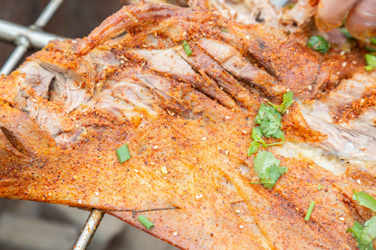 表面酥脆的一層皮輕輕一撥就開了鮮嫩的大腿肉讓人根本把持不住啊!羊烤好后送過(guò)來(lái)羊肉的香味撲面襲來(lái),安逸!