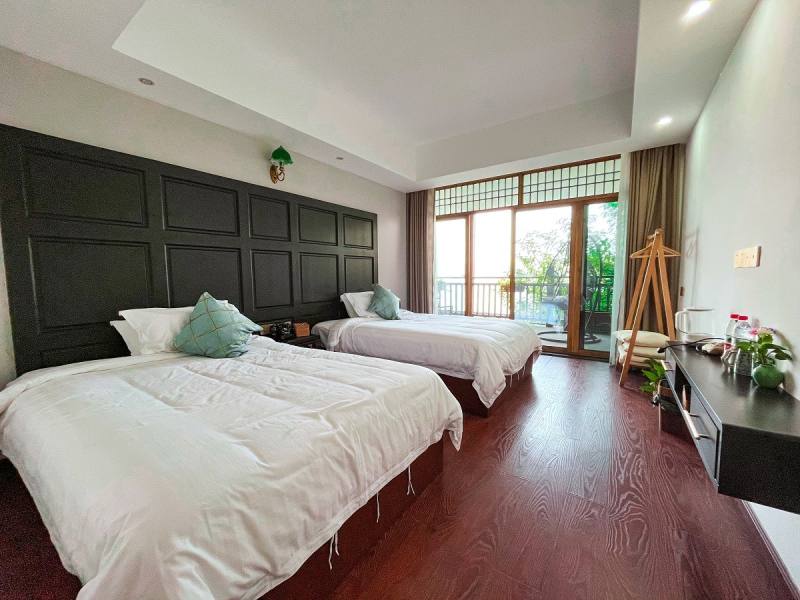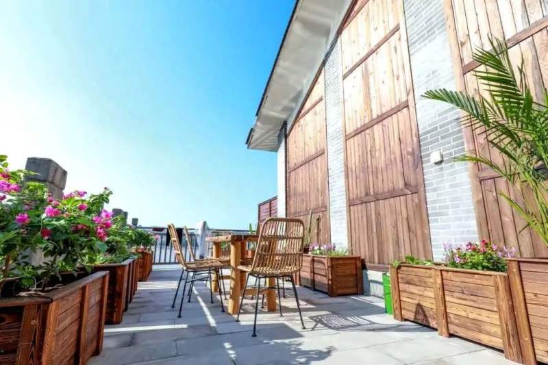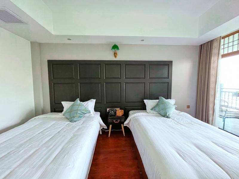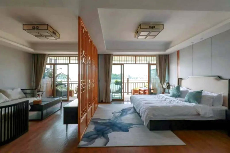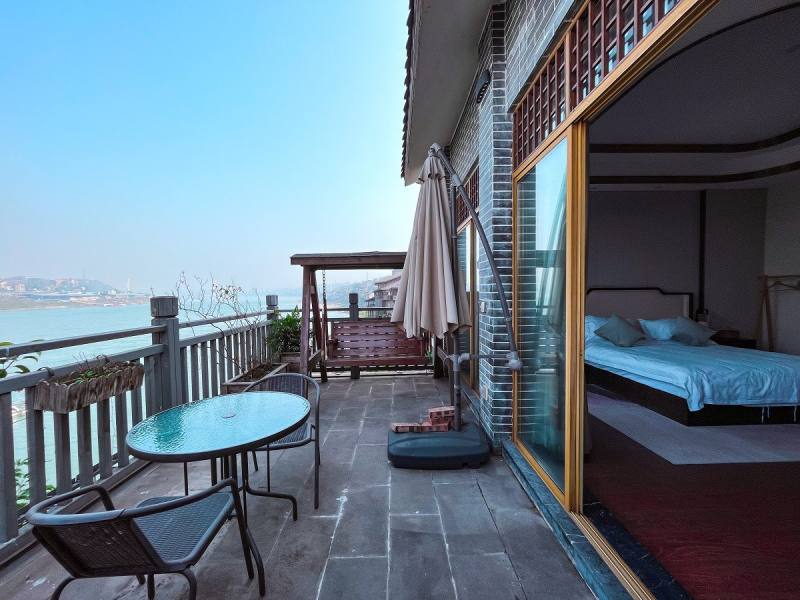 臨江的房間簡約大氣,以黑、白、原木色調(diào)為背景色,加以綠色點綴,繪成了一幅山水畫。大片的落地窗,直面長江美景。落地窗外設(shè)有大陽臺,茶幾、椅子、茶具、秋千安排的滿滿當(dāng)當(dāng)。碎花的小窗簾把臨街的房間裝點的更具活潑感,如果將臨江房形容成山水畫,那么臨街房就是一首田園詩。臨街房只設(shè)了一扇小小的窗戶,推開窗就是古鎮(zhèn)街景。入住于此,頗有一種“結(jié)廬在人境,而無車馬喧”之感。