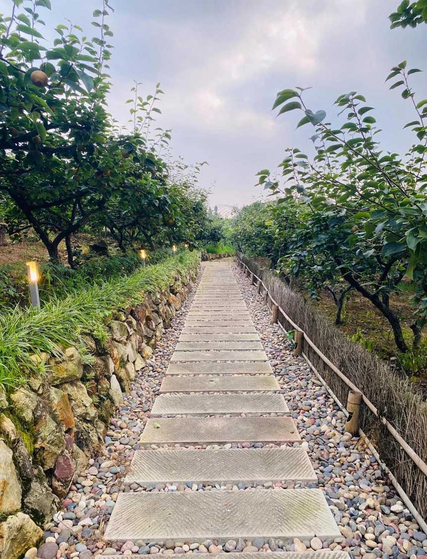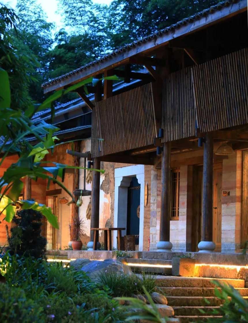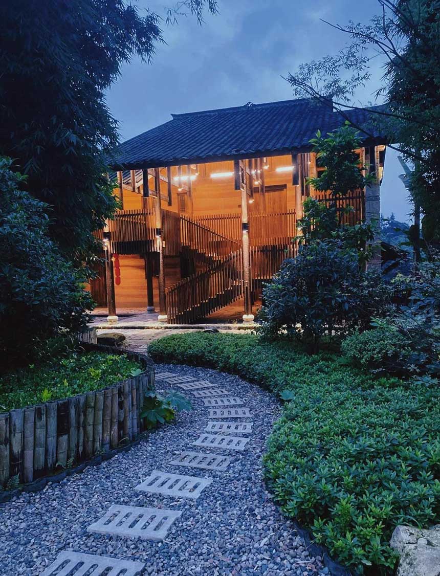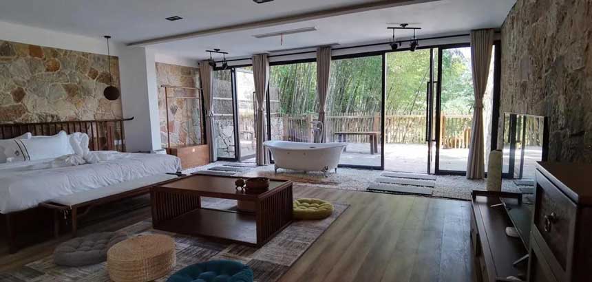 屋內(nèi),書柜、桌椅皆為木質(zhì),溫和且溫暖。木質(zhì)器具古樸大方,配以廳、室乃至花園,簡樸卻處處透露出用心。站在窗臺前,便可將遠近花海、鳥語竹濤盡收眼底。在由一半瓦片一半玻璃構成屋頂?shù)姆块g里,白天可以享受太陽的溫暖擁抱,夜晚則能枕著月兒,細數(shù)天上的繁星。