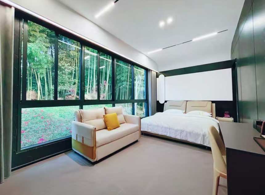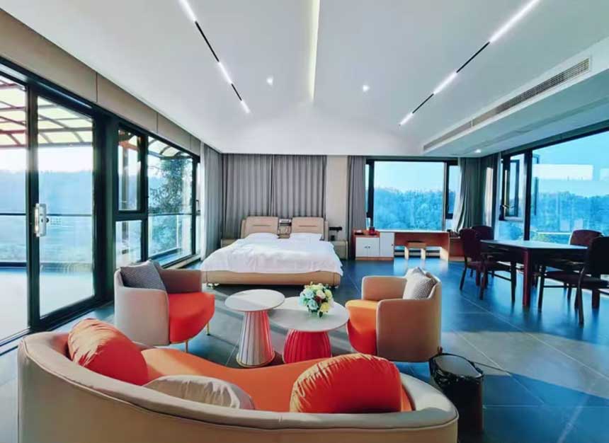 曼熙民宿由兩棟三層樓高的灰白色主體建筑構(gòu)成,總面積一千多平米。配套設(shè)施完善,盡顯高端前衛(wèi),超大的落地窗,湖光山色一覽無余。清晨看日出,傍晚觀日落,夜晚賞星空,盡享自然之美。