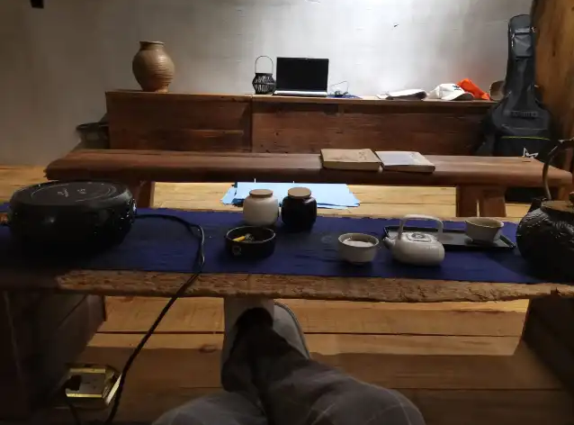 客棧一樓是一個(gè)可以喝茶的清吧,非常有設(shè)計(jì)感,特別適合幾個(gè)人有一搭沒(méi)一搭的聊天,大飛機(jī)偶爾還過(guò)來(lái)唱民謠唱搖滾。大飛機(jī)很像減肥后的宋冬野,聲音也很像稍微清淡一點(diǎn)的宋冬野。我問(wèn)大飛機(jī),作為帥氣主唱,是不是有很多女粉絲。當(dāng)然很多,他嘿嘿一笑,大媽也很多。