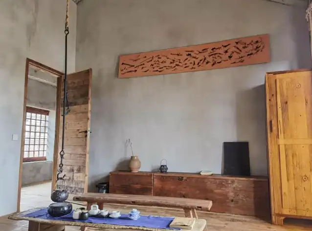 這樣的心境,正好配上這樣的客棧。一進(jìn)客棧的房間,古樸的墻頂,原生態(tài)的木桌,露著木紋的老柜。踩上精心打磨的新西蘭松木地板,散發(fā)著獨(dú)特的香和剛剛好的響。席地而坐,順手拿起房間準(zhǔn)備的《道德經(jīng)》,不經(jīng)意就看了好多頁(yè)。