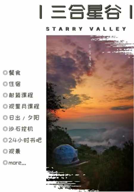 三合星谷所處的明月山環(huán)境優(yōu)美10年前村民自發(fā)組織種下了重慶少有的落葉松,讓這里的山林景色異于往常。于是從事設(shè)計領(lǐng)域9年的老板,選擇在這里,精心構(gòu)筑了一片豪華露營地。和大自然融為一體,享受非日常的生活,把到這里的一天過得不一樣,是STARRY VALLEY 最大的目標(biāo)。