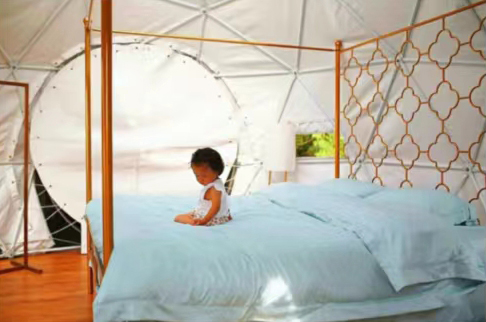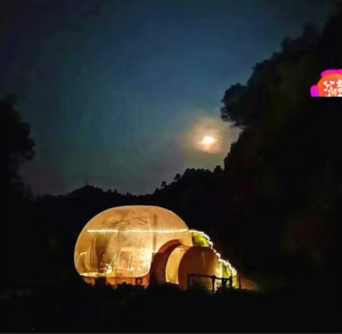 夜幕降臨,這里的美麗才剛剛開始暖黃色的燈光透過透明的泡泡屋可愛的充氣房子如同深山中的精靈籠罩出一層神秘的美感