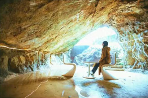 山谷有神秘奇特的溶洞風(fēng)景自然形成的溶洞,冬暖夏涼天然粗糙的巖石配上科技感強烈的擺設(shè)讓空間高級感十足