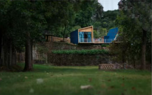 墨藍(lán)色的外觀頗具北歐風(fēng)情,顏色照應(yīng)森林被各種各樣的綠植包圍,顯得格外的清新自然