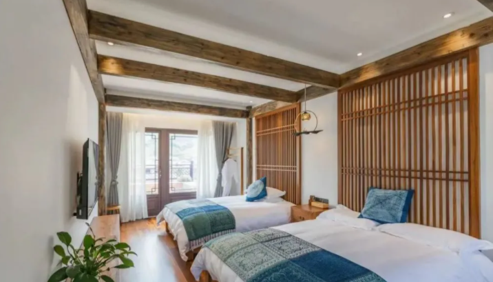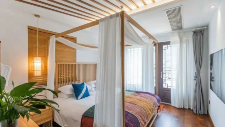 宿的10間客房風(fēng)格統(tǒng)一又各具特色(民宿客房只有8間對外,另外兩間不對外),大多是簡約溫馨的新中式古風(fēng),古樸的南美柚木令空間擁有了自然淡雅的底色,除了質(zhì)樸的原木色,還有純粹的白色、柔和的灰色、靜謐的藍(lán)色,客房將古樸與現(xiàn)代結(jié)合得雅致又溫馨。墻上山水閑逸的畫作里,鐫刻著“兩窗風(fēng)露影”的寫意生活。藍(lán)染土布抱枕、禪意古風(fēng)壁畫……禪意中亦流露出幾分返璞歸真的雅拙之意。