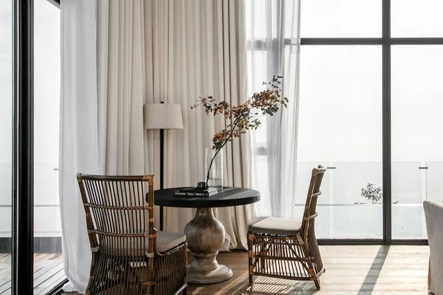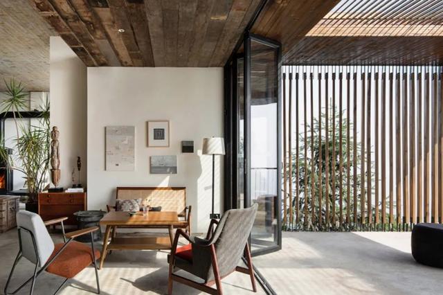 原木的家具與光的交織,移門滑過,光影斑駁。