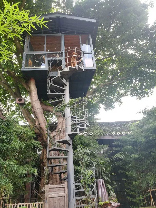 跨進“小棲”大門,就被眼前這素潔簡凈、恬淡清寧的院落撥動心弦。小小庭院,一排翠竹,一方舊石缸,一缸清凈水,營造出一種曲水流觴的意境。周圍幾縷爬藤綠色植物,盡顯古樸天然,翠竹下有青草蔓延,有多肉植物自然生長。院落中還有一株枝葉繁茂的大樹矗立,更有意思的是,在這大樹遠離地面的樹杈上、繁葉里,有一個像鳥窩一樣的茶屋!