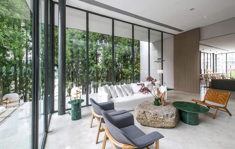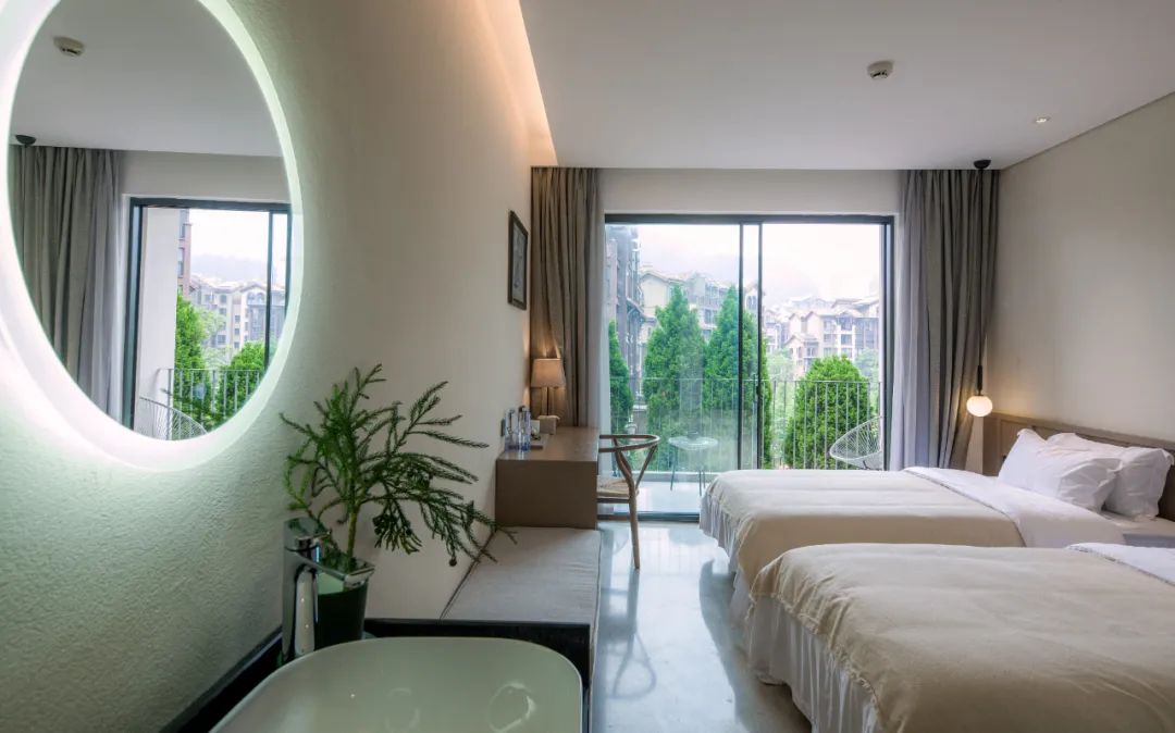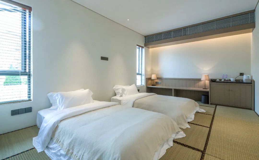 柳杉間的定位為人文藝術(shù)酒店,占地面積2000平方米。它的前身是新場小學(xué),主教學(xué)樓與操場之間有一排整齊的柳杉樹,幾十年來與學(xué)校共生長,成了民宿的一道獨特風(fēng)景。一樓房間是一個后退的空間,用幾級臺階營造出“步入”的儀式感;原來的窗戶向外拓展成一個突出的空間,成為茶室,坐在一樓的茶室,可享受窗外淺池倒映柳杉樹的美景。樓上的房間統(tǒng)一更改了門的朝向,原來開門的位置成為小型露臺。這樣,柳杉間每一個房間的露臺、茶室,都能看到這里最經(jīng)典的柳杉樹。