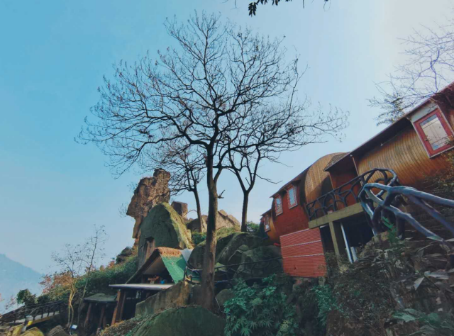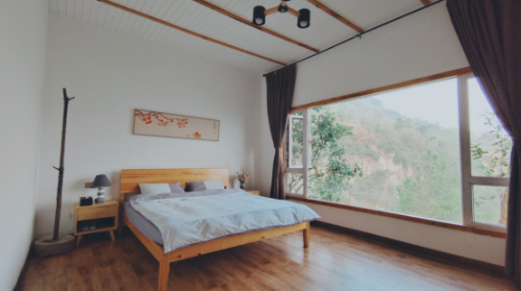 新月灣·人間之里民宿為太空艙、茅草屋套房,太空艙外形類似太空機(jī)艙,為全景玻璃、原木生態(tài)裝飾,360度江景房坐落于石人腳下,給人居高臨下之感。