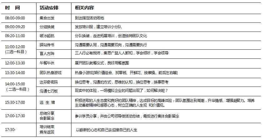 一個類似公司管理卻偏重于溝通的拓展培訓(xùn)科目,主要把團(tuán)隊(duì)分為領(lǐng)導(dǎo)階層,高管階層和基層員工階層來實(shí)行,領(lǐng)導(dǎo)的決策,高管的傳遞,基層員工的忙碌,體現(xiàn)了現(xiàn)代企業(yè)最為真實(shí)的一面。領(lǐng)導(dǎo)的意圖是揣摩?是執(zhí)行?還是溝通到位在實(shí)施……