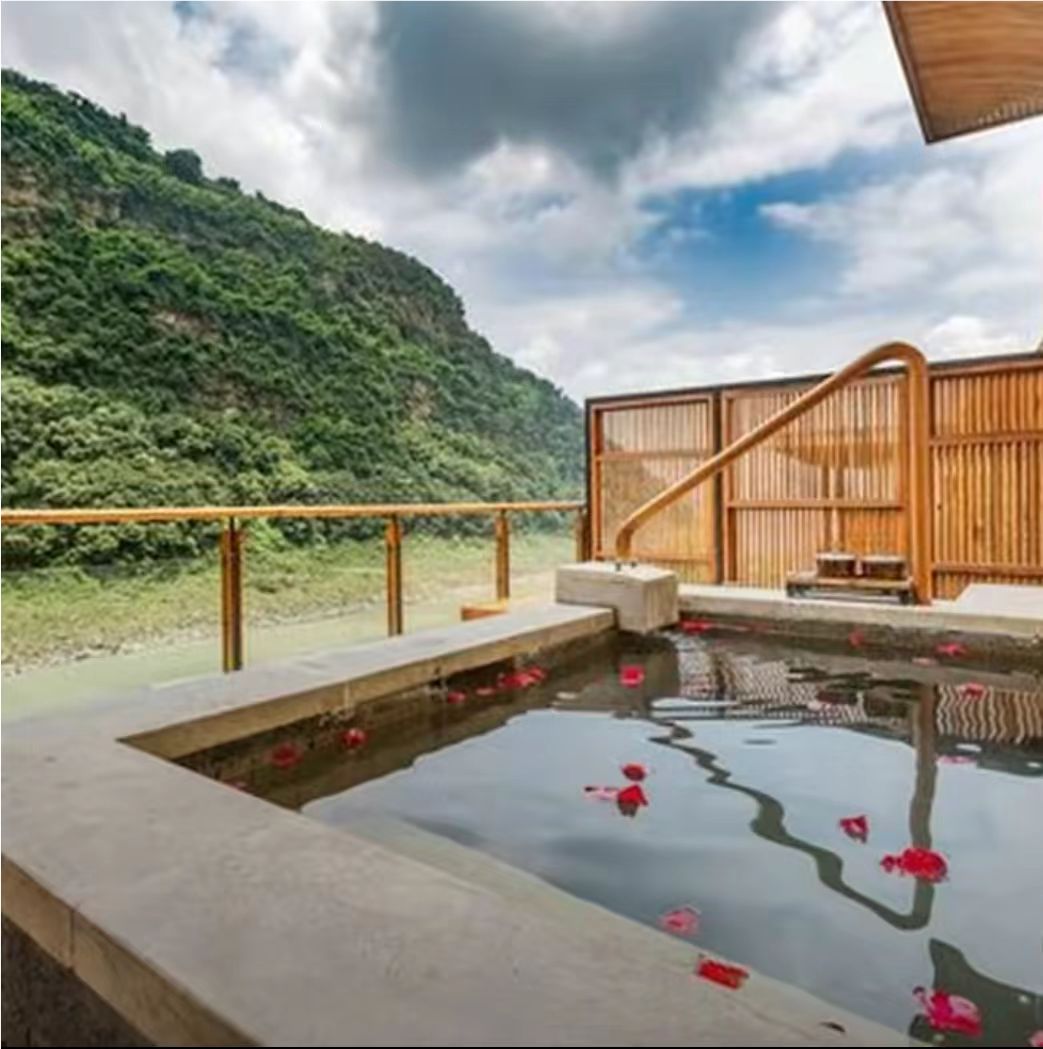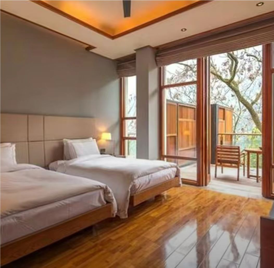 重慶柏聯(lián)溫泉精品酒店風(fēng)景秀麗,面朝嘉陵江,被群山環(huán)抱,綠植豐茂。酒店在 建筑文化定位時(shí),結(jié)合縉云山溫泉寺與中國(guó)傳統(tǒng)禪意結(jié)合,于自然之中點(diǎn)綴建筑,融 入自然景觀和重慶北溫泉文化,體現(xiàn)酒店“自然”風(fēng)格主題。