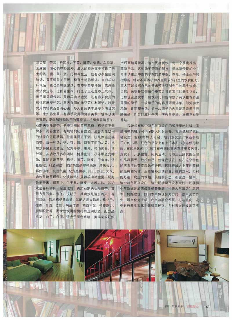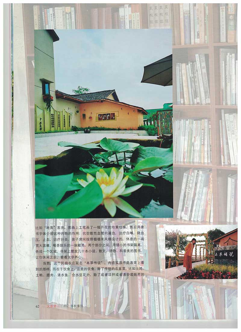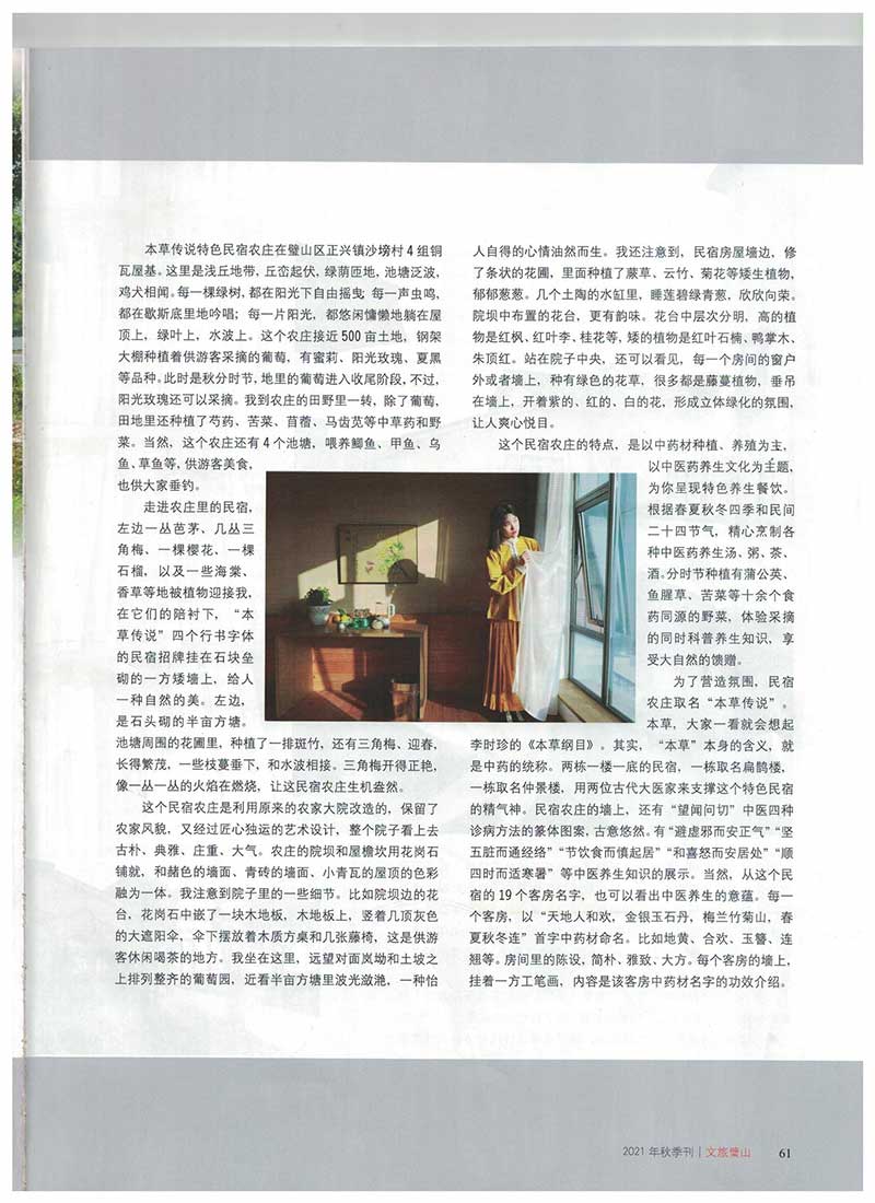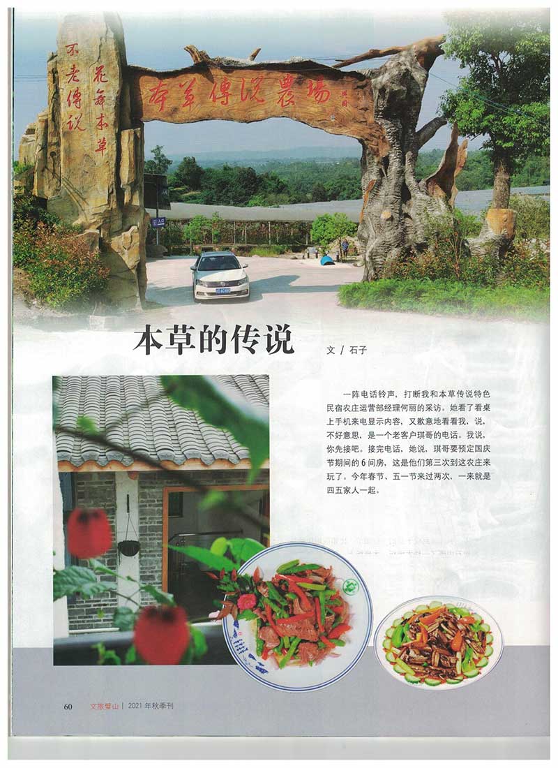 璧山區(qū)本草傳說家庭農(nóng)場(chǎng)是一家綠色種植、養(yǎng)殖、加工中藥材,以中醫(yī)藥養(yǎng)生文化為主題農(nóng)文旅融合發(fā)展的特色民宿,交通便捷,環(huán)境舒適。利用原有農(nóng)家大院改造而成的民宿農(nóng)場(chǎng),既保留了農(nóng)家風(fēng)貌又經(jīng)過匠心獨(dú)運(yùn)的藝術(shù)設(shè)計(jì),顯得古樸典雅,莊重大氣。農(nóng)場(chǎng)面積近500畝,種植有蜜莉、陽(yáng)光玫瑰、夏黑等葡萄品種;4個(gè)池塘喂養(yǎng)著鯽魚、甲魚、烏魚、草魚等;分時(shí)節(jié)種植有蒲公英、人參菜、穿心蓮、養(yǎng)心菜、馬齒筧、薺菜、薄荷、魚腥草、苦麻菜等十余個(gè)食藥同源的野菜。除了傳統(tǒng)的農(nóng)家菜,比如土雞、土鴨、臘肉、清水魚、河水豆花外,還能品嘗到農(nóng)場(chǎng)的特色餐飲,根據(jù)春夏秋冬四季和民間二十四節(jié)氣,烹制有松茸土雞養(yǎng)顏湯、黃芪鯽魚護(hù)肝湯、野菜養(yǎng)生土雞湯、三七紅棗正氣粥、佛手玫瑰養(yǎng)胃茶、魚腥草茶等中醫(yī)藥養(yǎng)生湯粥茶酒。民宿客房19間,以“天地人合歡,金銀玉石丹,梅蘭竹菊山,春夏楸冬連”中藥材命名(即天麻、地黃、人參、合歡、金蓮、銀杏、玉簪、石榴、丹參、臘梅、吊蘭、文竹、杭菊、山茶、迎春、半夏、川楸(qiu)、麥冬、連翹),有單間、標(biāo)間、親子房多種房型可選。寬敞明亮的餐廳可供200人同時(shí)用餐。會(huì)議室能容納40人會(huì)議、培訓(xùn)及交流。戶外休閑區(qū)可挖野菜、放風(fēng)箏、蕩秋千、烤全羊、烤香豬。露天草坪里能開展露營(yíng)、團(tuán)建和拓展活動(dòng)。民宿農(nóng)場(chǎng)榮獲2021年新媒體酒店必住榜暨重慶《抖音人氣酒店》總冠軍、璧山區(qū)2021年“最美巾幗民宿(農(nóng)家樂)示范店”稱號(hào)。被推薦為2022年重慶市鄉(xiāng)村振興干部培訓(xùn)現(xiàn)場(chǎng)教學(xué)基地。