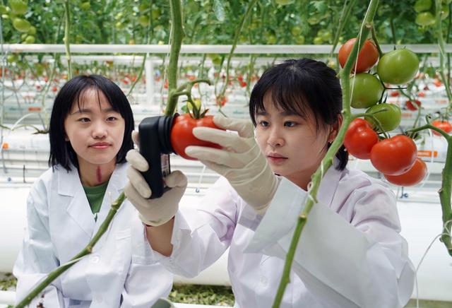 ↑5月28日,在位于平谷區(qū)峪口鎮(zhèn)的京瓦溫室園藝示范園,西樊各莊科技小院駐村大學(xué)生朱思蓉(右)測量番茄果實(shí)硬度。 在北京市平谷區(qū)峪口鎮(zhèn)西樊各莊村科技小院,駐扎著一...